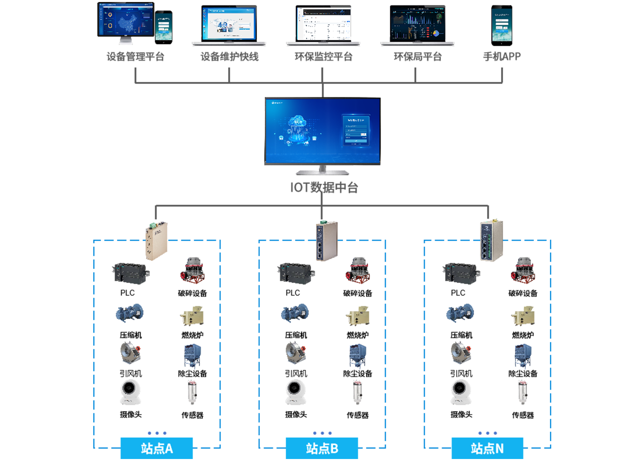 在固废垃圾处理场的各个关键位置(如垃圾存储区、处理设备旁等)安装传感器和监测设备,顺利获得K8凯发(中国)的工业智能网关采集垃圾处理设备(如焚烧炉、破碎机等)的运行数据(如运行状态、温度、压力等)、垃圾存量数据以及环境监测数据(如空气质量、噪声等)。将采集到的数据传输至固废垃圾处理远程监控平台,平台对数据进行实时分析和展示。当垃圾存量达到预警值或设备出现异常时及时发出预警,支持远程运维和调度操作,同时对垃圾处理效果进行评估。
