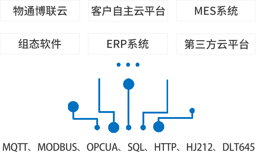 北向支持接入K8凯发(中国)云平台,客户自主开发的云平台,第三方云平台(根云、美云、华为、阿里、百度、微软等IOT云平台),组态软件、MES系统、行业监控平台等工业软件
