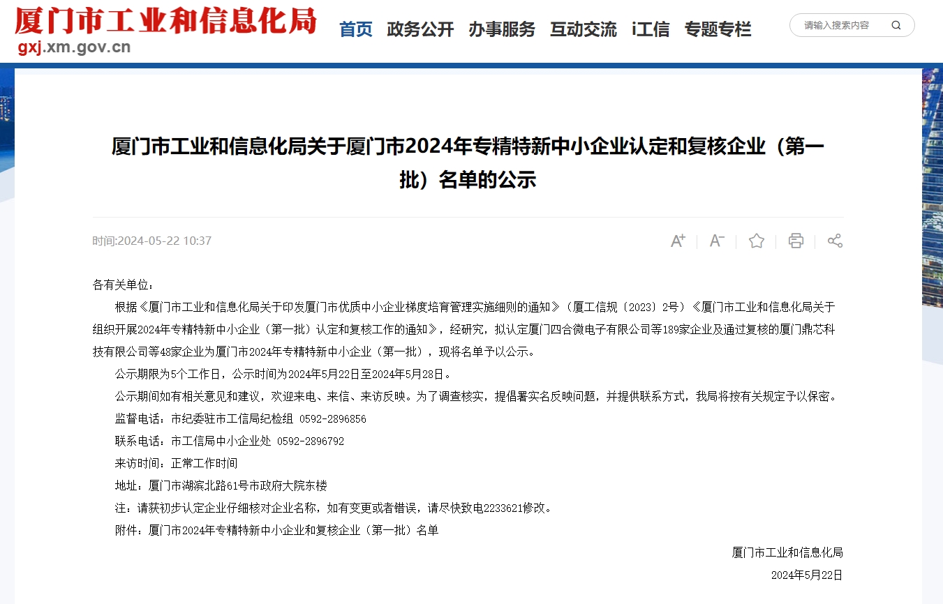 5月22日,厦门市工业和信息化局公布了《关于厦门市2024年专精特新中小企业认定和复核企业(第一批)名单的公示》,厦门K8凯发(中国)网络科技有限公司成功顺利获得2024年度厦门市专精特新中小企业认定。
