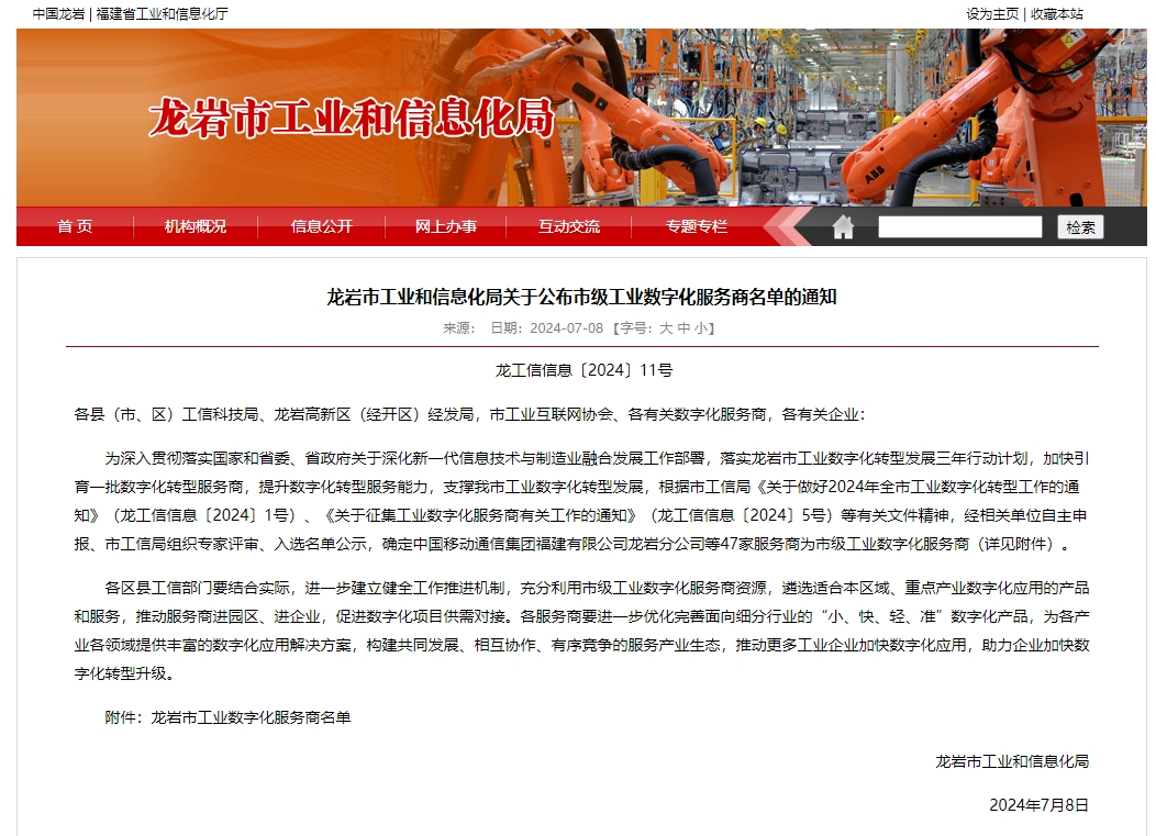 7月8日,龙岩市工信局公布了《龙岩市工业和信息化局关于公布市级工业数字化服务商名单的通知》,厦门K8凯发(中国)网络科技有限公司成功入选“龙岩市市级工业数字化服务商”。