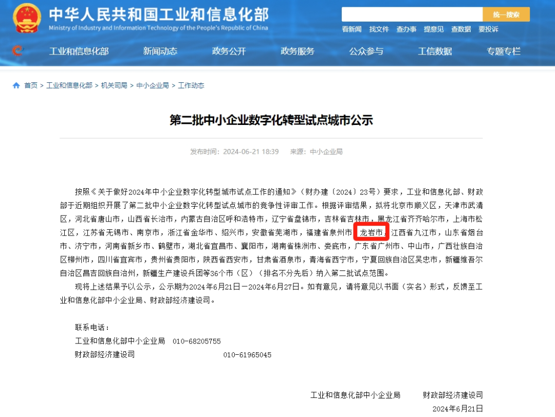 龙岩市是第二批中小企业数字化转型试点城市,6月21日工信部、财政部对入选第二批中小企业数字化转型试点城市名单进行公示,龙岩入选。标志着龙岩市在有助于中小企业数字化转型上迈出坚定步伐,并取得国家认可。中央财政将对入选地级市给予1亿元奖补资金,主要用于支持中小企业数字化改造、工业互联网平台建设、数字化服务商培育,以及支持召开咨询诊断、人才培训、数字化转型融资等。