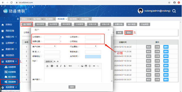 在云平台的网关管理中添加新网关的信息,必填项为:网关系列号(大写) 、网关所属站点和运营状态,其余为选填项。