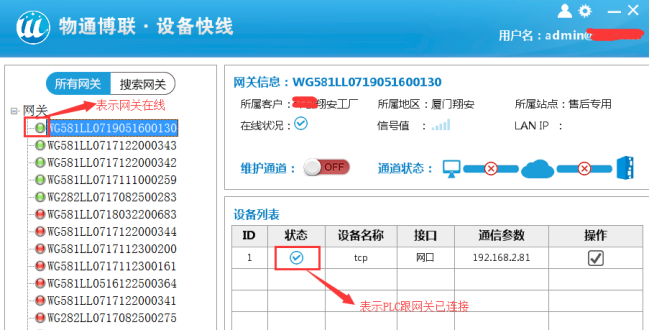 点击建立通道,如果该网关没有其他维护工程师在维护,就会建立起通道,通道建立后,就可以使用PLC编程软件或者其他组态软件对远程操作设备。