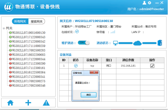 顺利获得所属客户、所属地区、所属站点以及通信参数等确认是要维护的设备,点击维护通道进行连接,如下图,也可以顺利获得“搜索网关”搜索到要维护的网关。