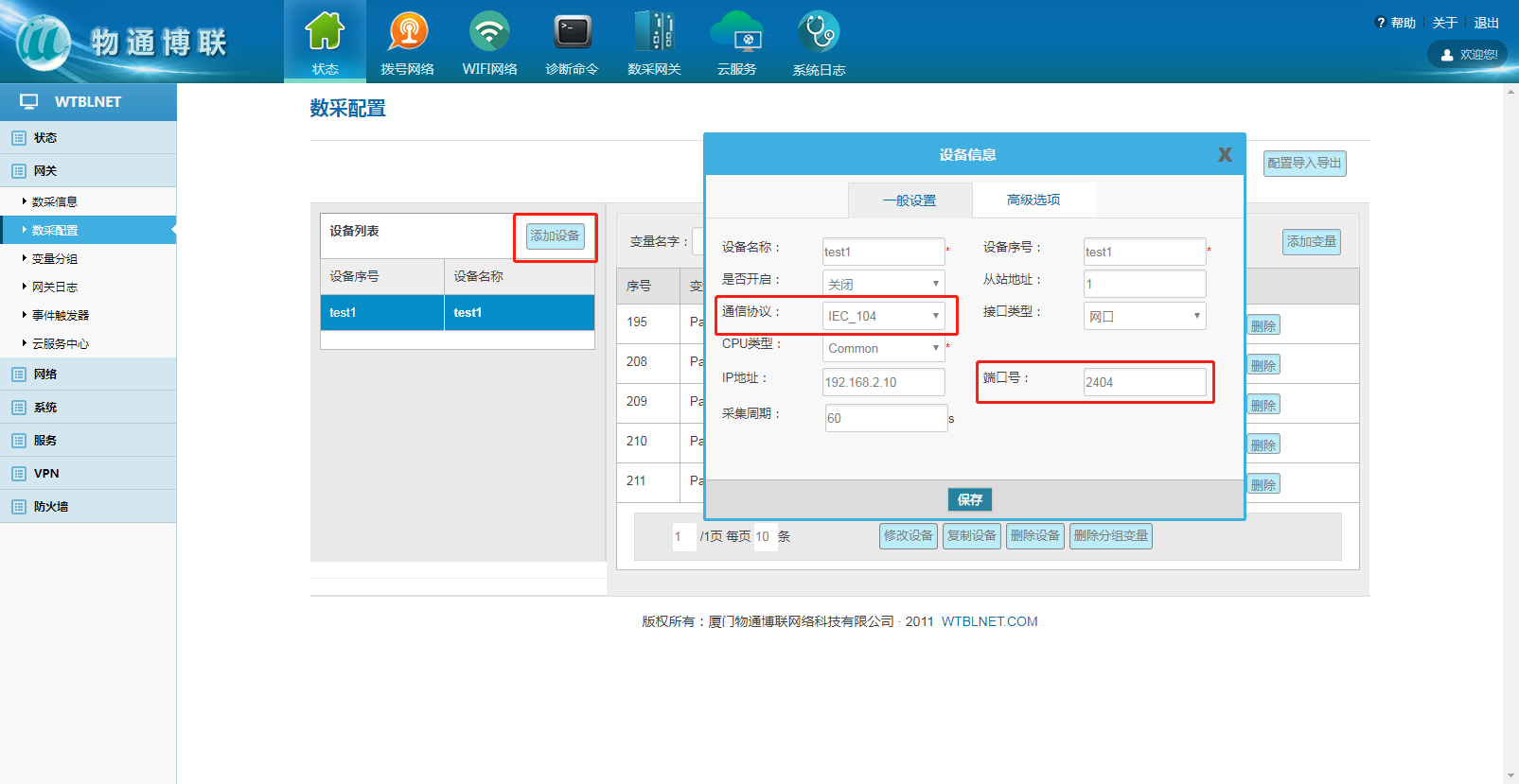 一般设置:通讯协议选择ICE-104,端口默认设定为2404,IP地址根据网关下挂设备实际情况进行定义;