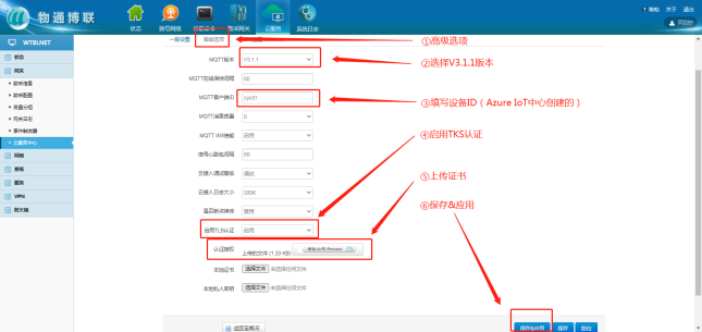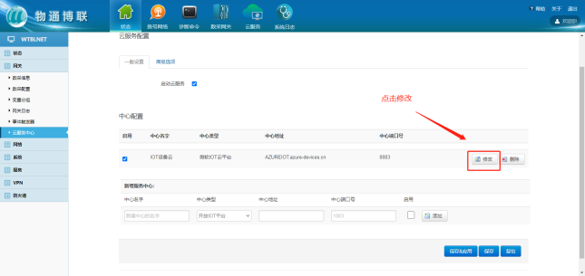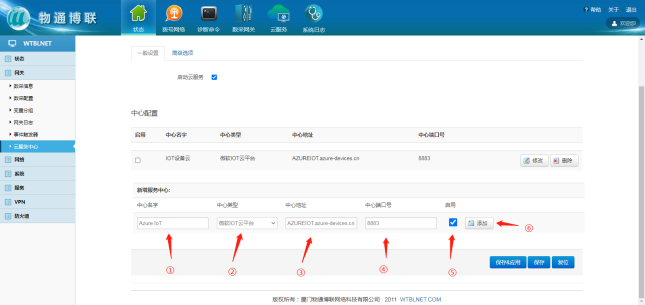 选择“微软云平台”,打开K8凯发(中国)网关WEB界面,新建一个连接中心,中心类型选择微软IoT云平台,输入相应信息,勾选启用,点击“添加”