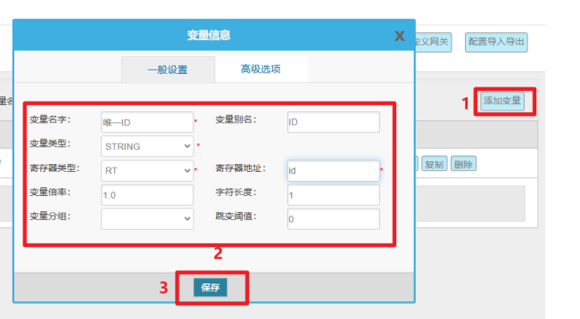 变量配置主要是定义变量名(自定义内容,不可使用中文命名)、变量别名(自定义,可使用中文名字)、寄存器类型和寄存器偏移地址,并定义一些数据规则(如:倍率、小数点、单位、告警)。