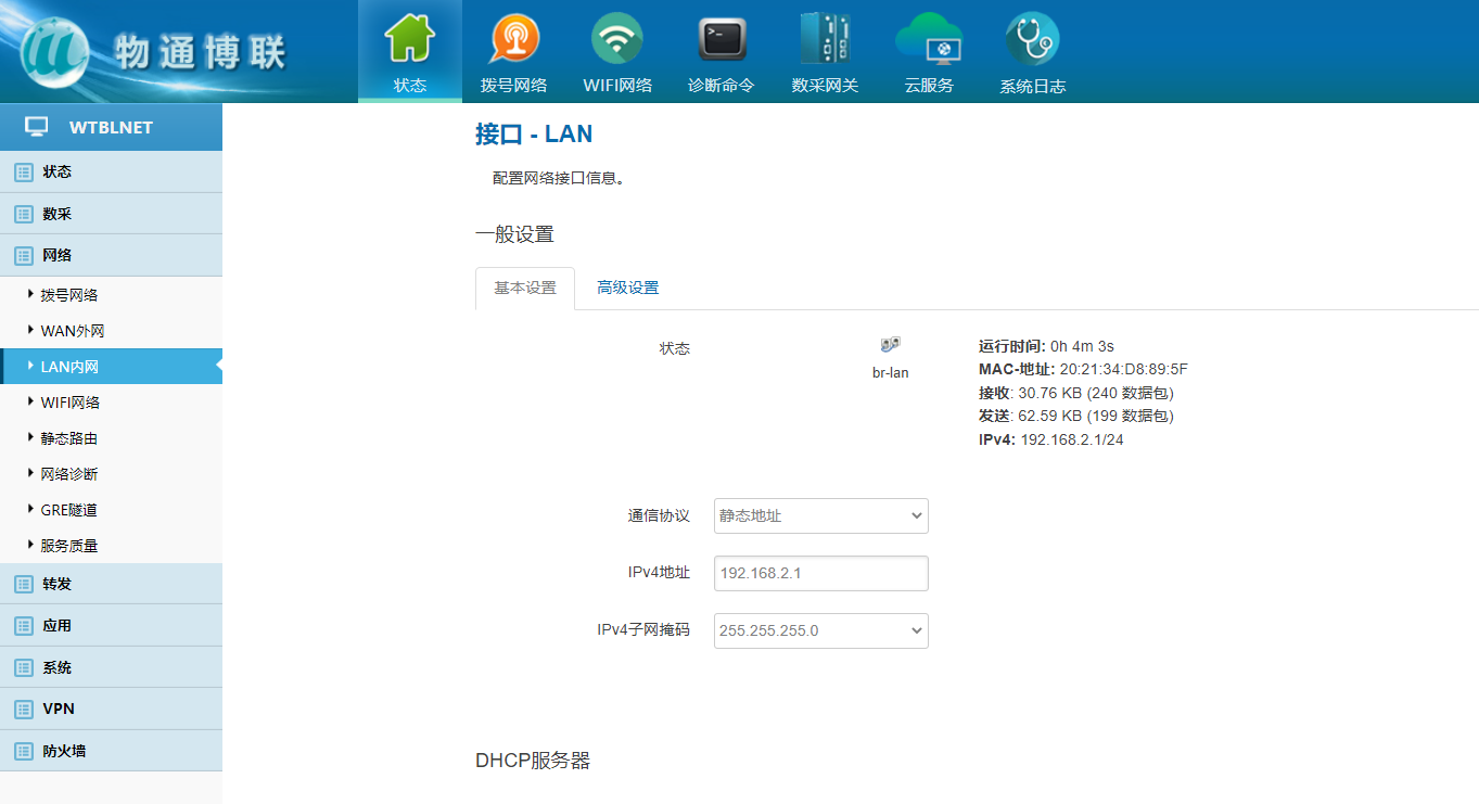 下载中心 视频中心 常见问题 售后服务 工业网关 设备快线 数据云平台 联网设备 问答百科 如何修改工业智能网关的LAN口IP地址? 时间:2022-10-26 09:06:09 点击:4989 关键词:工业智能网关,LAN口 问题:如何修改工业智能网关的LAN口IP地址? 回答: (1)电脑直连网关,确保电脑与网关处于同网段或者自动获取 浏览器里面输入192.168.2.1 (2)登陆网关配置界面 默认用户名/密码:admin/123456 (2)选择网络——Lan内网——更改IPV4地址、子网掩码,保存应用 (3)注意电脑本机IP地址是否与更改地址处于同网段(自动获取需重新拔 插网线) (4)浏览器输入更改后的IP地址登陆到网关配置界面即修改成功 上一篇:工业智能网关和DTU有什么区别吗? 下一篇: 工业智能网关需要另外配4G路由器吗?