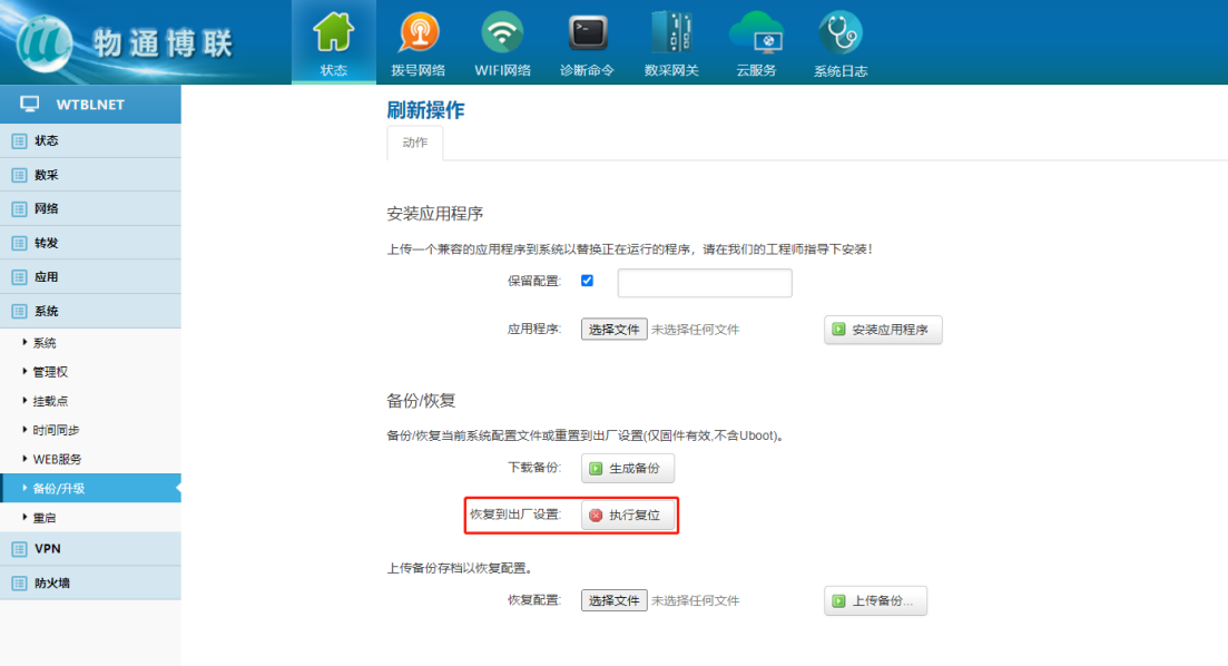 下载中心 视频中心 常见问题 售后服务 工业网关 设备快线 数据云平台 联网设备 问答百科 工业智能网关如何进行软硬件复位? 时间:2022-10-26 09:13:38 点击:5783 关键词:工业智能网关,网关复位,网关重启 问题:工业智能网关如何进行软硬件复位? 回答: (1)硬件复位 第一时间断电后再通电重启设备网关,当网关指示灯STATUS和WARN交替闪烁后,立即长按RESET键,直到ERROR灯慢闪后松开(或3秒后松开),再次长按RESET键,直到ERROR灯快闪后松开按钮(或3秒后松开),网关开始复位 (2)软件复位 系统——备份/升级——恢复到出厂设置 上一篇:工业智能网关如何设置静态固定IP? 下一篇: 工业智能网关和DTU有什么区别吗?