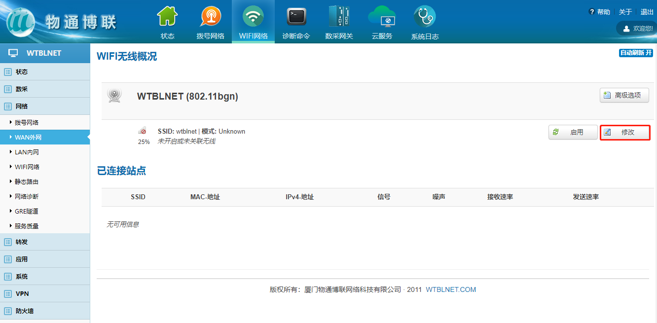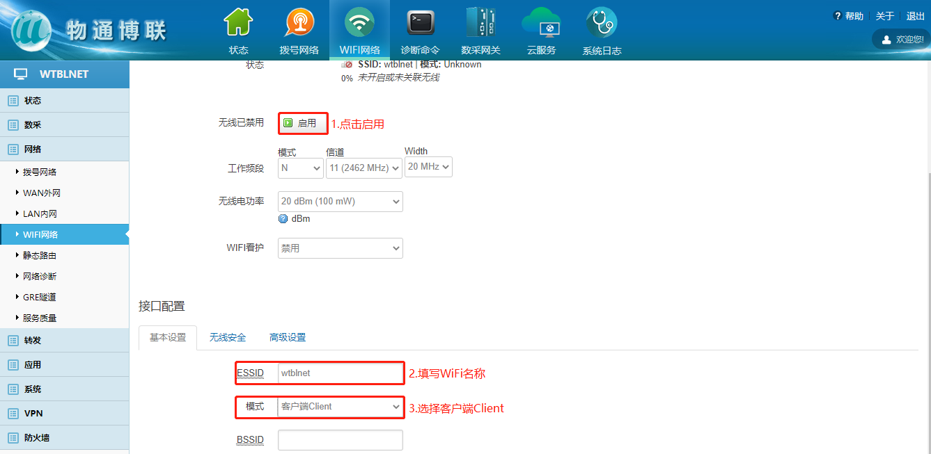 下载中心 视频中心 常见问题 售后服务 工业网关 设备快线 数据云平台 联网设备 问答百科 工业智能网关如何连接wifi热点? 时间:2022-10-26 09:15:30 点击:5406 关键词:工业智能网关,wifi 问题:工业智能网关如何连接wifi热点? 回答: (1)电脑顺利获得网线接入到网关LAN口,浏览器输入192.168.2.1默认地址 (2)登陆网关配置界面选择WiFi网络 (3)点击WiFi界面修改—进入WiFi配置界面 (4)启用WiFi—填写ESSID(WiFi名称)—模式选择客户端Client (5)点击无线安全—输入WiFi密码 注意:WiFi获取到的IP网段与网关LAN口的IP网段不能重复! 上一篇:工业智能网关如何更新程序和固件? 下一篇: 工业智能网关如何使用流量卡上网?