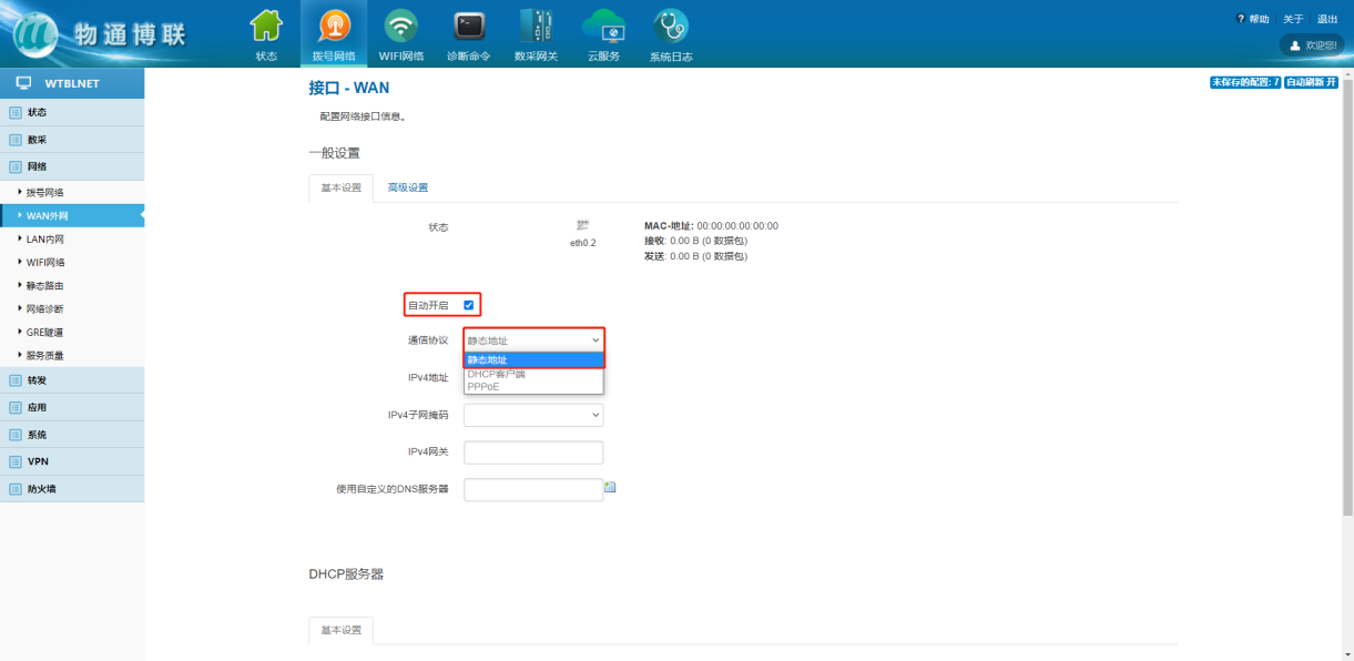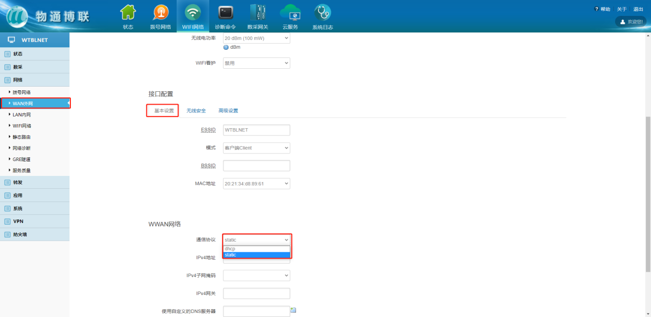 下载中心 视频中心 常见问题 售后服务 工业网关 设备快线 数据云平台 联网设备 问答百科 工业智能网关如何设置静态固定IP? 时间:2022-10-26 09:15:30 点击:5101 关键词:工业智能网关,静态固定IP,网关配置 问题:工业智能网关如何设置静态固定IP? 回答: (1)WAN外网设置静态IP 网络—WAN外网—切换通信协议——填写固定IP参数 (2)WiFi网络设置静态IP 网络—WiFi网络—修改—切换通信协议—填写静态IP 上一篇:工业智能网关如何使用网线上网? 下一篇: 工业智能网关如何进行软硬件复位?