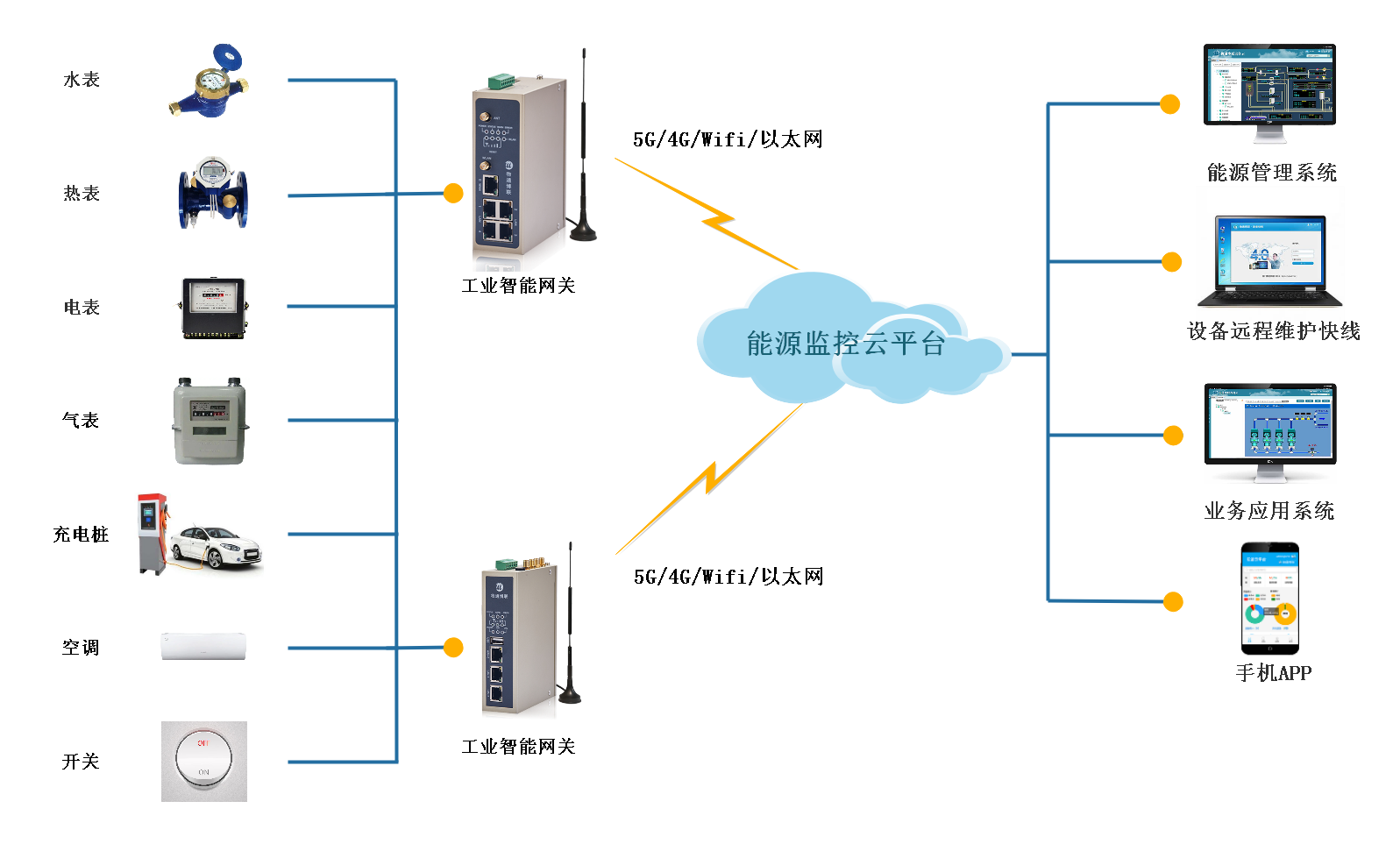 能源采集网关将水电气表与网关连接,实现数据采集,并将数据顺利获得5G、4G、WIFI、有线以太网等方式上传到管理平台,实现设备数据远程监控,远程管理,远程维护,能耗管理。