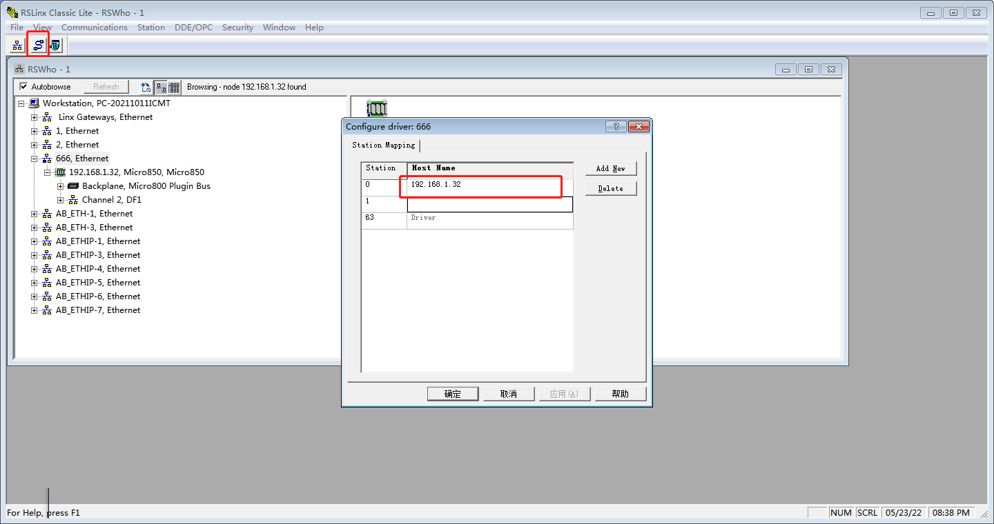 (2)打开RSlinx插件,点击连接,地址填写PLC IP地址。