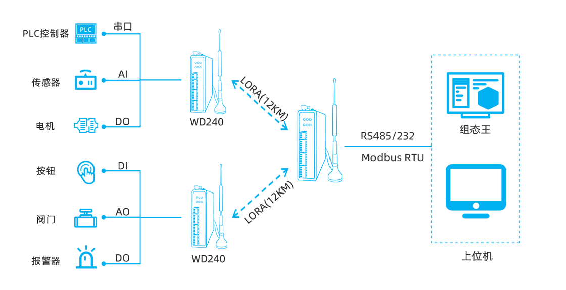 示例 WD240-LM0844-485(8AI-4DI-4DO,国内频段:410~493MHz,485串口)