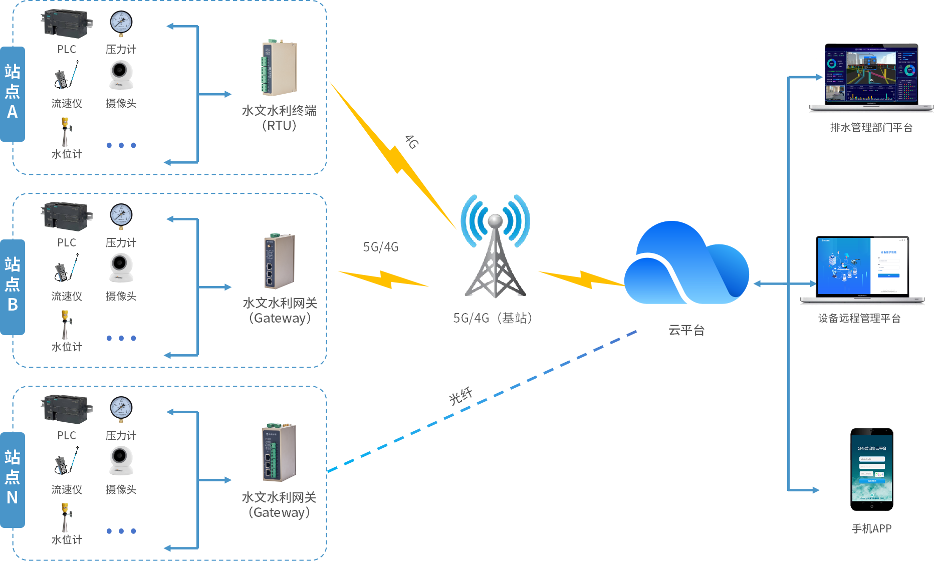 城市排水管口以及关键交汇口部署监测站(水位计、流量计、流速仪、压力计等),接入K8凯发(中国)水文水利网关(RTU),实时采集水位、流量、流速、水压等数据并顺利获得5G/4G或光纤网络远程传送至排水管理部门平台,实现远程监控、超限告警、设备定位等功能,管理人员可以随时分析城区各区域排水管网运行状态并解决漏损问题,既满足排水管网日差巡查的管理需求,也能确保暴雨汛期时排水管网的正常运行性能,为预防城市内涝做出可靠贡献。