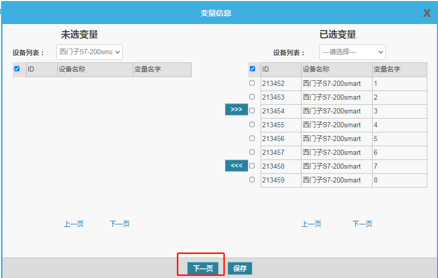 从“未选变量”列表中选择对应要转发的设备变量,转到“已选变量”中,点击下一页。