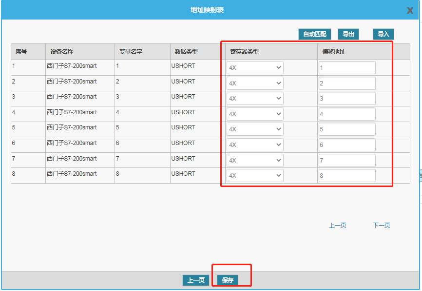 配置“地址映射表”,寄存器类型根据采集配置的数据类型进行选择