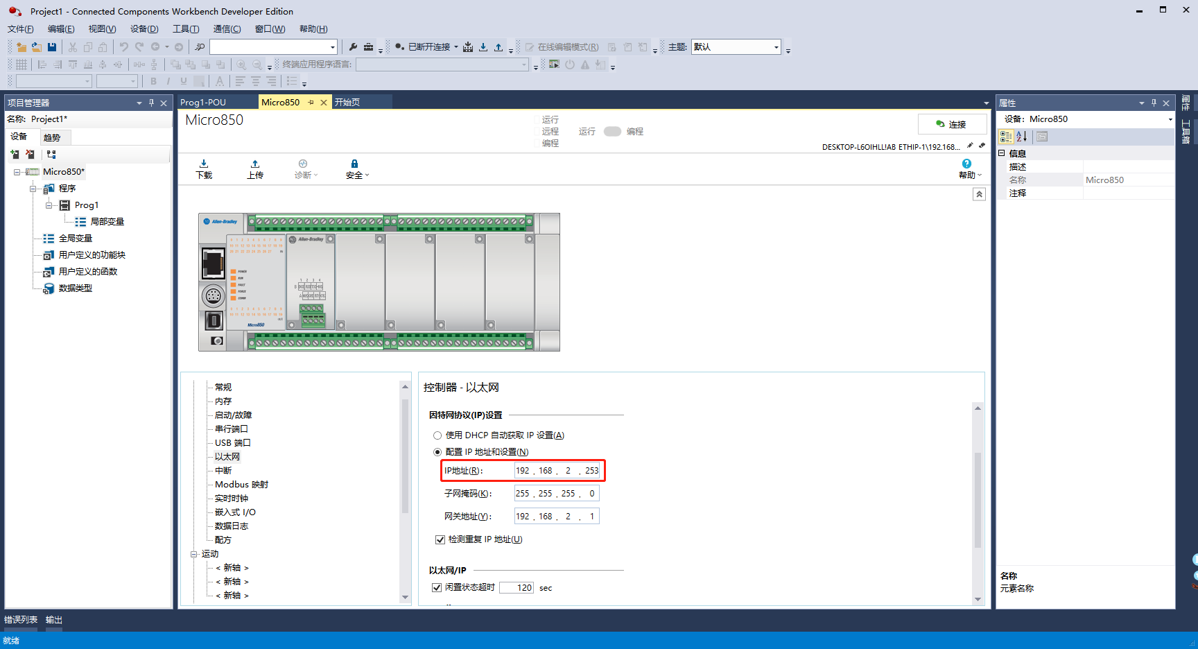 工具/材料: 1、笔记本电脑(或带双网卡的台式电脑)、线材(网线) 2、K8凯发(中国)·工业智能网关 3、Connected Components Workbench编程软件 操作步骤 1 以太网通讯设置 PLC采用网口通信,请确保PLC的地址和网关LAN口地址在同一个网段。网关LAN口地址(默认:192.168.2.1)可登陆网关WEB管理界面:网络-LAN内网地址中修改。 1、Allen-Bradley Micro850与电脑顺利获得网络连接,利用Connected Components Workbench获取与设置IP地址、子网掩码与默认网关。