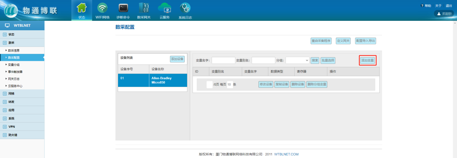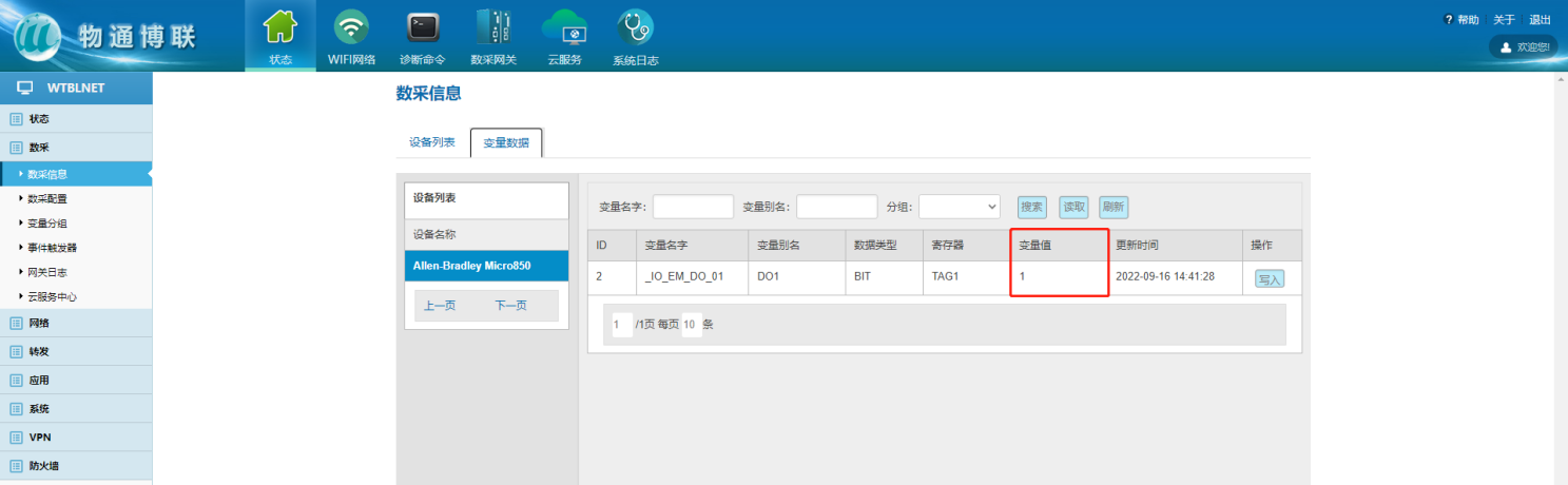 AB_DF1变量配置示例 (3)数据看板 数采配置(设备信息+变量参数)完成后,重启采集程序并生效配置,即可在:数采信息—变量数据—设备名称中看到采集上来的数据。
