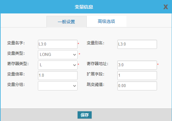 AB_DF1设备配置示例 (2)变量配置 PLC采用网口通信时,变量配置主要填写变量名(网口协议较为特殊,需配置成与PLC内的变量名一致)、变量别名(自定义,建议使用中文),寄存器类型和寄存器地址无需配置(默认即可),可定义一些数据规则(如:倍率、小数点、单位、报警规则等)。