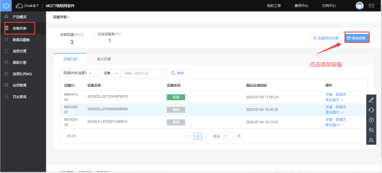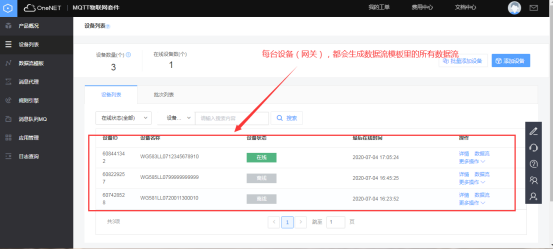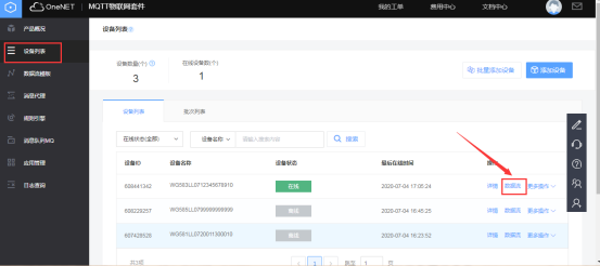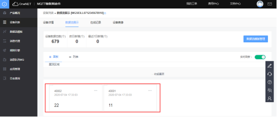 3、数据在平台上展示 进入one net平台查看网关对应的数据流