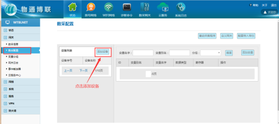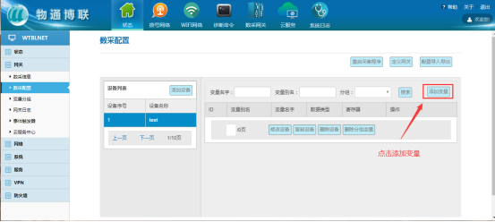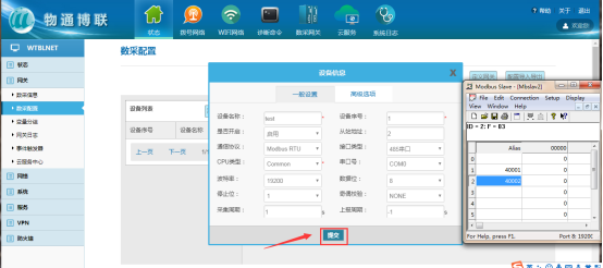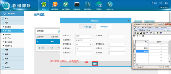 4 网关采集数据上传平台 1、添加设备、变量 在网关中添加对应要采集的设备(plc,仪器仪表等,文档中用modbus slave软件模拟采集数据,模拟软件详细操作跳过,如果疑问可咨询)