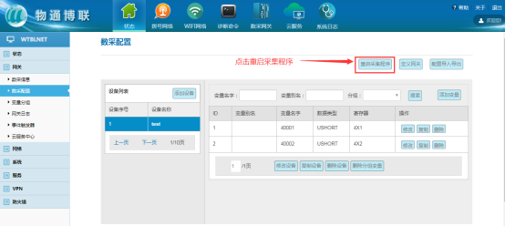 2、重启采集程序 设备和变量添加完毕后,要重启采集程序,使配置生效