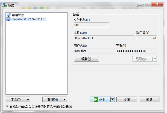 第二步:打开WinSCP软件,将文件协议配置为SCP,主机IP:192.168.214.1 端口号:22,用户名manufact,密码大写:SUNRISE。