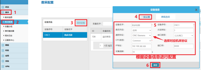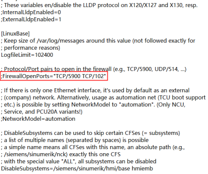 第四步:备份好后打开文件,找到;FirewallOpenPorts="TCP/5900 TCP/102"这一行,把前面的“;”分号删除,然后保存,把文件拖拽到右边CNC文件进行覆盖,覆盖过程中会出现权限不够(不用管),直接点OK。然后点击打开文件进行确认是否修改成功。 第五步:重启设备后连接X130网口,尝试连接102端口看是否成功。 3 网关数采配置 1.设备配置 根据CNC设备情况及信息配置后保存。