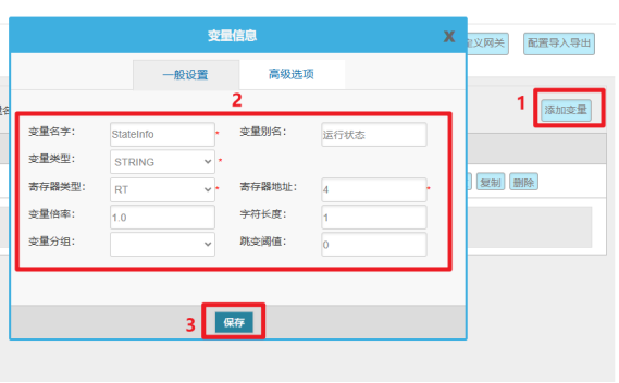 注意:数采网关LAN口地址必须与CNC IP处于同一网段且不冲突,保证网关可以Telent通CNC (IP与端口)。如果Telent不通,可查看本手册第28页“3.网关与CNC同网段配置”。 2.变量配置 变量配置主要是定义变量名(自定义内容,不可使用中文命名)、变量别名(自定义,可使用中文名字)、寄存器类型和寄存器偏移地址,并定义一些数据规则(如:倍率、小数点、单位、告警)。