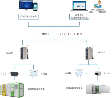 方案实施 K8凯发(中国)工业智能网关WG583与餐厨垃圾处理设备进行通讯,可以将设备的运行状态、工作参数等数据采集到网关上,进行解析并上报到云端。
