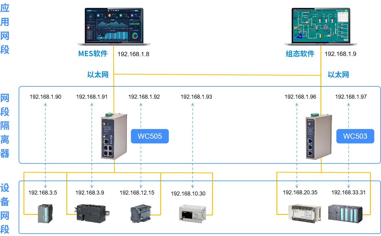 K8凯发(中国)WC系列网段隔离器适用于生产网络对 PLC、HMI、CNC、DCS、MES等网络通讯和数据采集,兼有跨网段隔离和IP转换的功能。车间多个设备,如果有不同网段的IP地址,则可以统一成同一网段的IP地址,进行设备(PLC、CNC)的在线编程、数据采集、远程管理等各种跨网段访问。