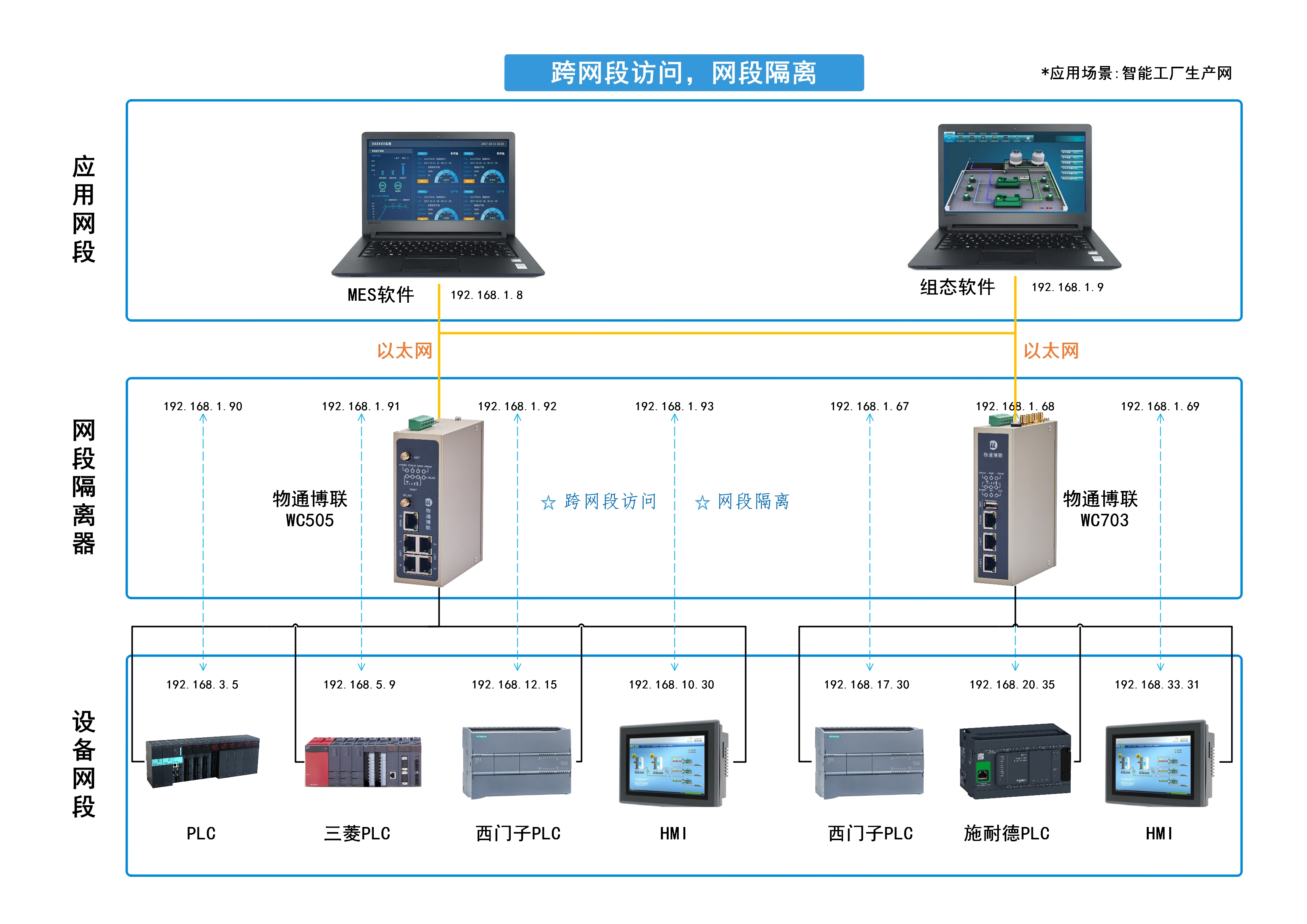 WC703网段隔离器(NAT转换网关)适用于生产网络对 PLC、HMI、CNC、DCS、MES等网络通讯和数据采集,兼有跨网段隔离和IP转换的功能。同时支持2台以上设备(如PLC、CNC等)网段隔离和NAT 转换;车间多个设备,如果有不同网段的IP地址,则可以统一成同一网段的IP地址,进行设备(PLC、CNC)的在线编程、数据采集、远程管理等各种跨网段访问。