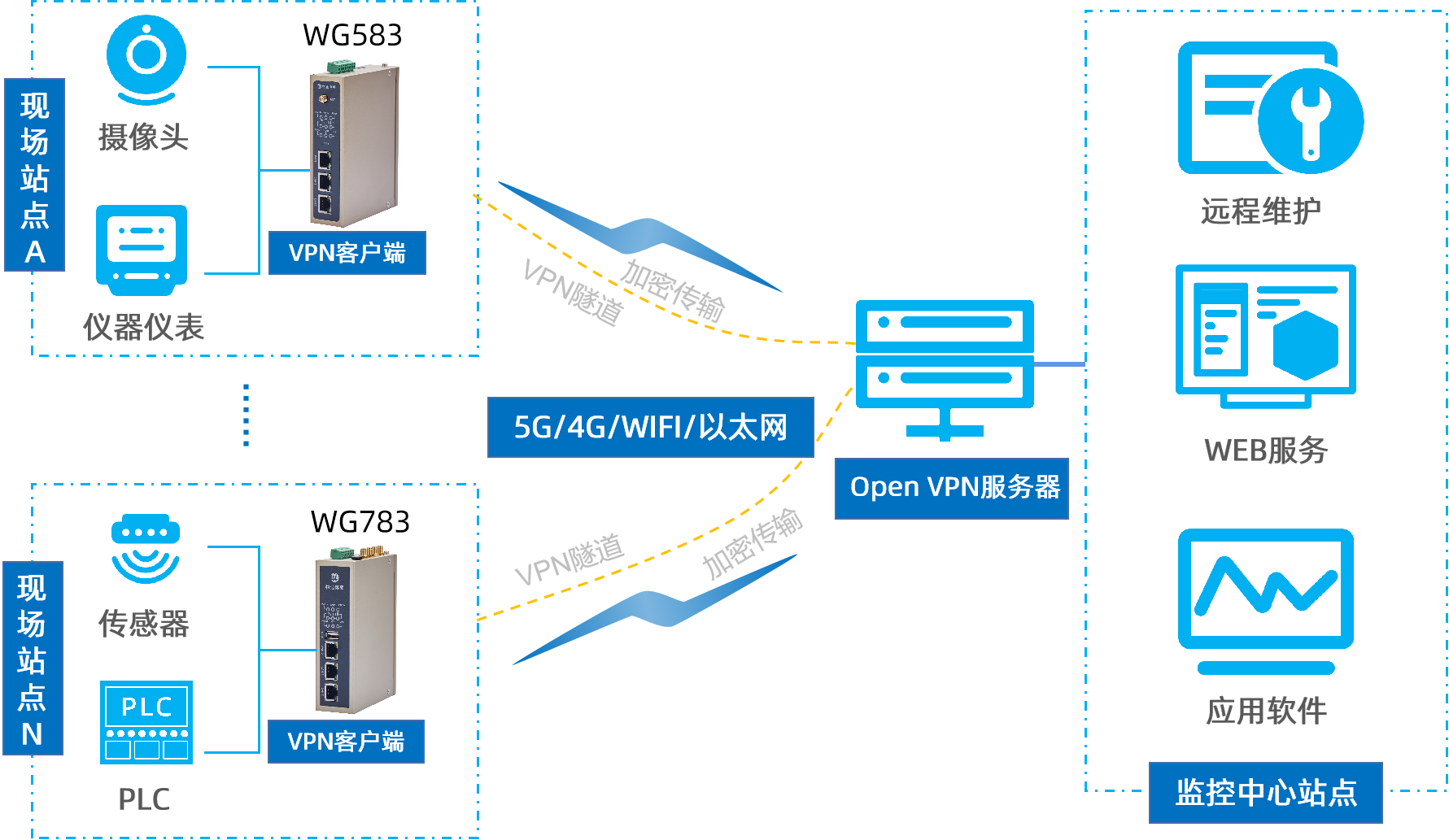K8凯发(中国)OpenVPN网关顺利获得对工业现场包括PLC、仪表、传感器或者工控机等在内的设备进行实时状态、参数、故障等数据的采集,顺利获得5G/4G/ WIFI/以太网等联网方式将数据上传至服务器进行储存(顺利获得网关为VPN客户端利用OpenVPN技术在原有网络基础上建立一个加密的虚拟网络通道,实现数据加密传输,保障数据的安全性和完整性),即可在数据中心将其显示、分析,从而分析现场环境以及现场设备的相关信息参数以及运行情况,实现对现场设备的远程监控、数据分析、远程维护。