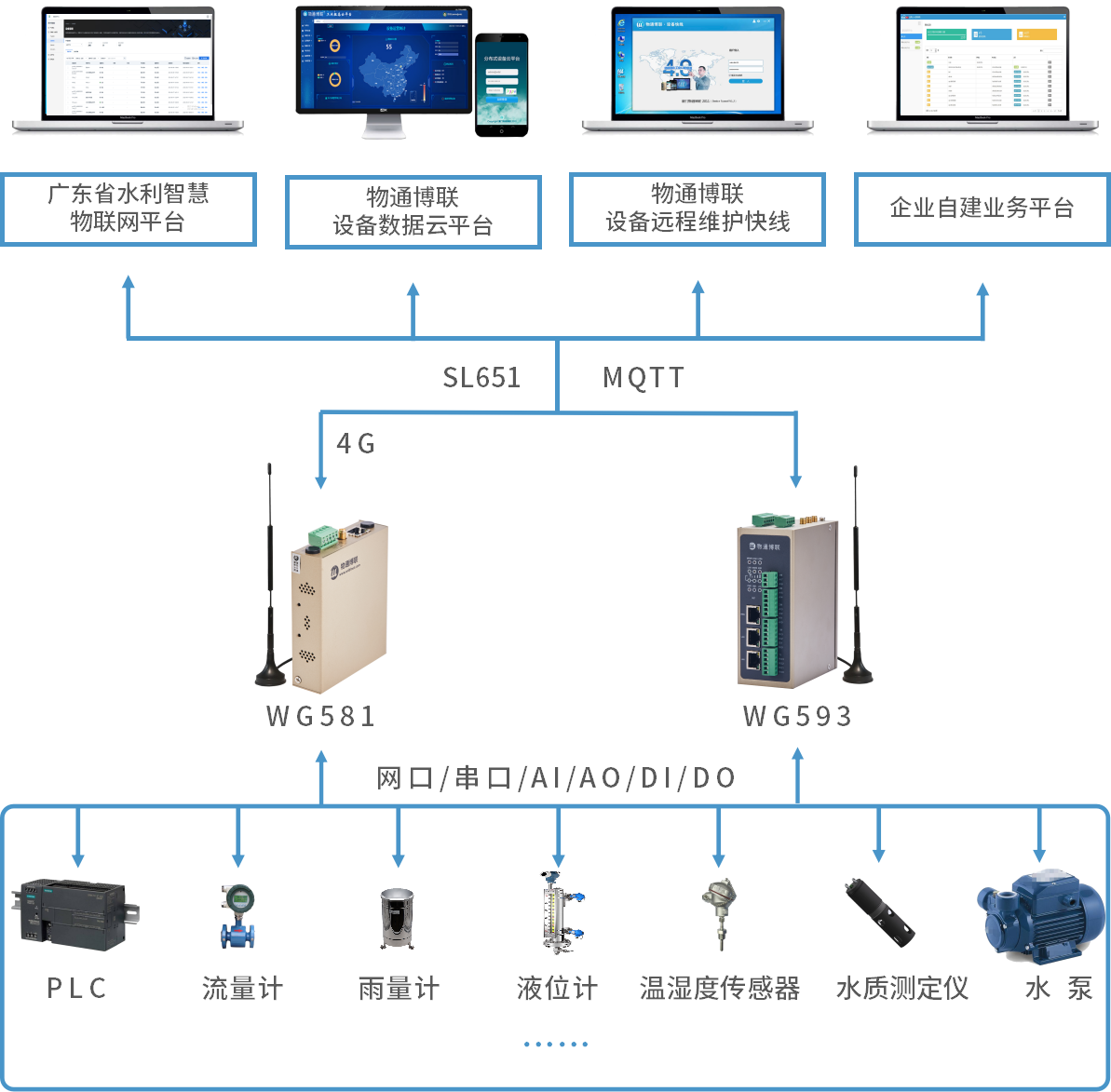 顺利获得K8凯发(中国)工业智能网关采集PLC、流量计、温湿度传感器、雨量计、液位计等等相关设备数据,将流量、流速、水位、水深、温度、湿度、水压等等数据顺利获得边缘计算、数据标准化后以4G/WIFI等网络方式顺利获得MQTT/SL651等协议传输到广东省水利智慧物联网平台或者企业自建业务平台。