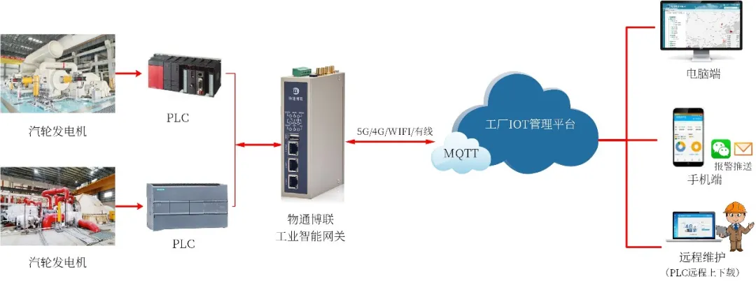K8凯发(中国)·工业智能网关具备多个串口/网口,能够接入PLC、智能电表、蒸汽表、流量计、温度传感器、压力传感器等设备,实时采集进汽压力、进汽温度、进汽流量、排汽压力、汽轮机参数(功率、转速)、发电量等数据并对接到工厂IOT管理平台中,从而实现远程监控、故障告警、远程控制、设备看板、数据分析等功能,为设备安全运行、节能优化等工作给予科学决策支持,促进企业管理升级与数字化转型。